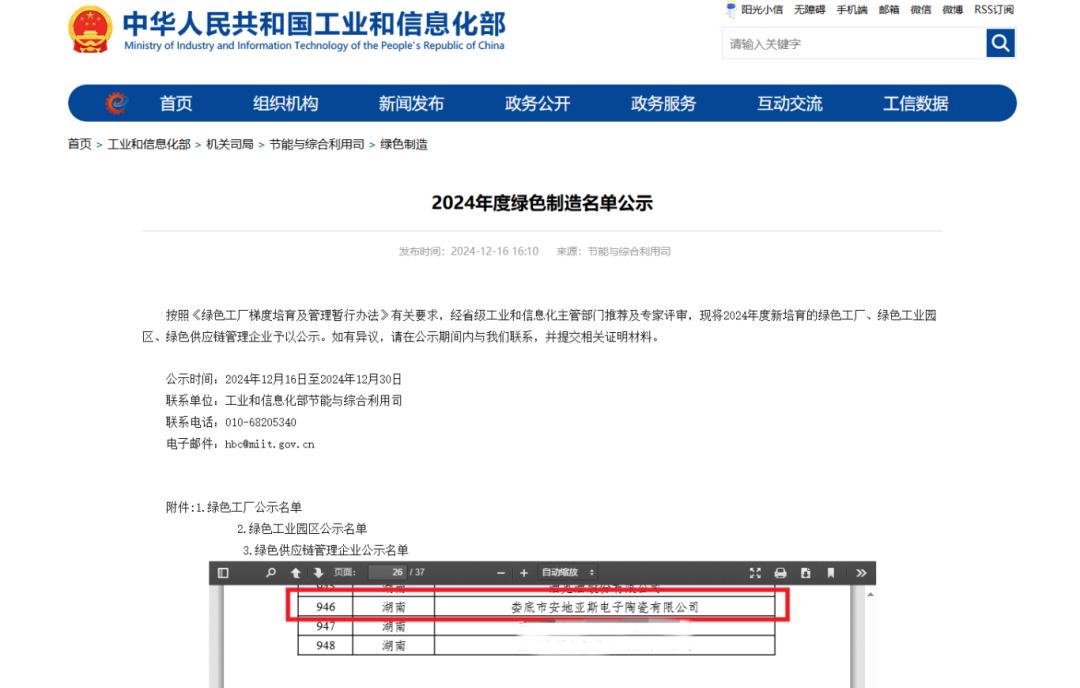 在可持續(xù)發(fā)展浪潮澎湃的當(dāng)下,工業(yè)領(lǐng)域的綠色轉(zhuǎn)型成為時(shí)代的必答題。近日,工業(yè)和信息化部公布了《2024年度綠色制造名單》,安地亞斯憑借在綠色制造領(lǐng)域的卓越表現(xiàn),榮獲“國(guó)家級(jí)綠色工廠(chǎng)”稱(chēng)號(hào),此榮譽(yù)是公司在綠色制造領(lǐng)域首創(chuàng)突破,更是為電子陶瓷行業(yè)樹(shù)立了新標(biāo)桿。